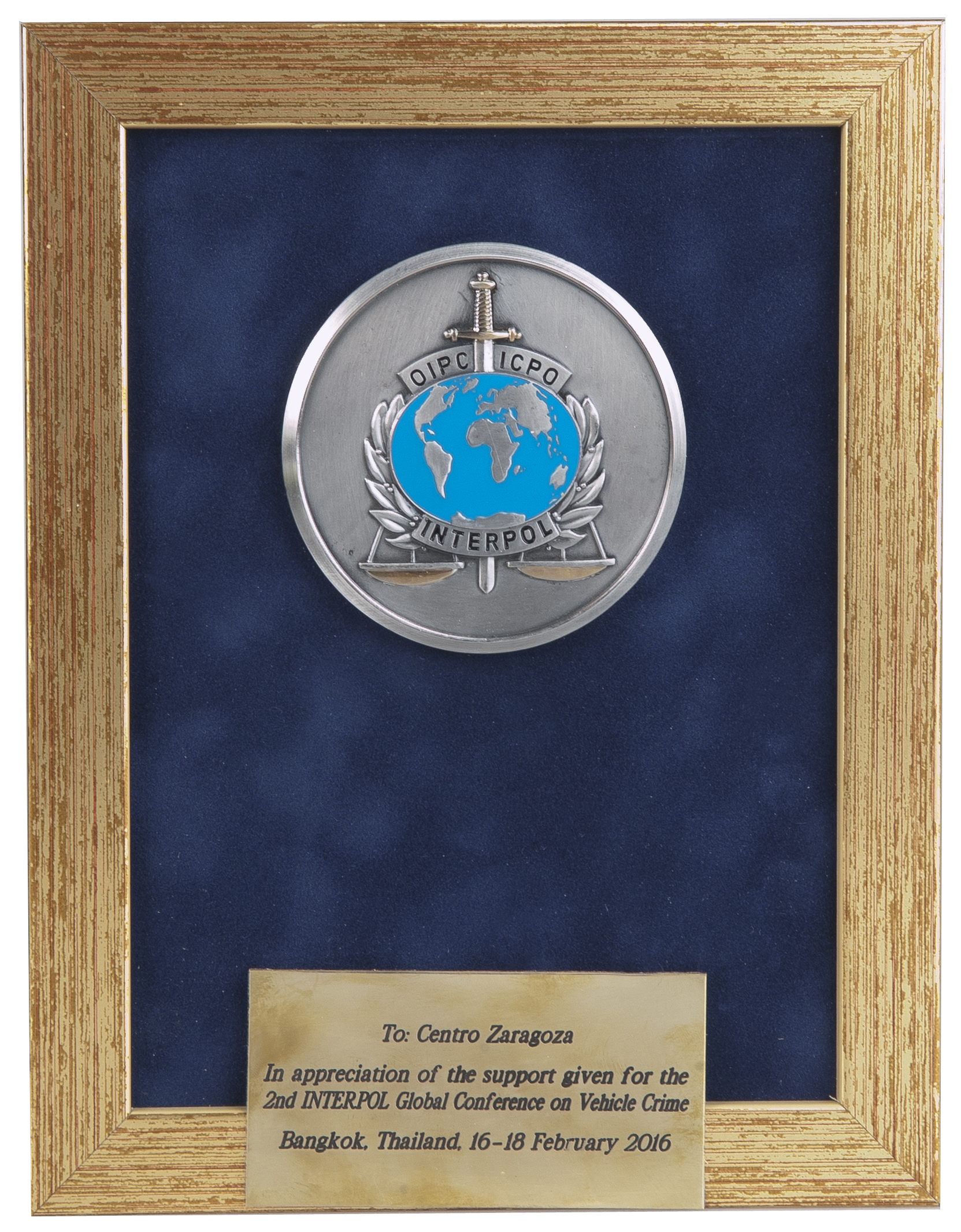 La Secretaria General de Interpol ha entregado una placa conmemorativa a Centro Zaragoza como agradecimiento a su apoyo operativo a las diferentes actividades relacionadas contra el tráfico ilícito de vehículos que realiza Interpol. La entrega se ha producido durante la la ‘2ª Conferencia Mundial de Interpol sobre delitos relacionados con los vehículos’, en la que CZ ha sido parte activa.