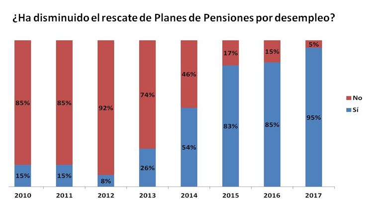 La encuesta también refleja que el rescate por desempleo ha disminuido en el último año (95%). 1 de cada 3 entidades cuantifica esa disminución por encima del 10%. En 2012, el porcentaje de gestoras que señalaban que había disminuido el rescate apenas alcanzaba el 8%.