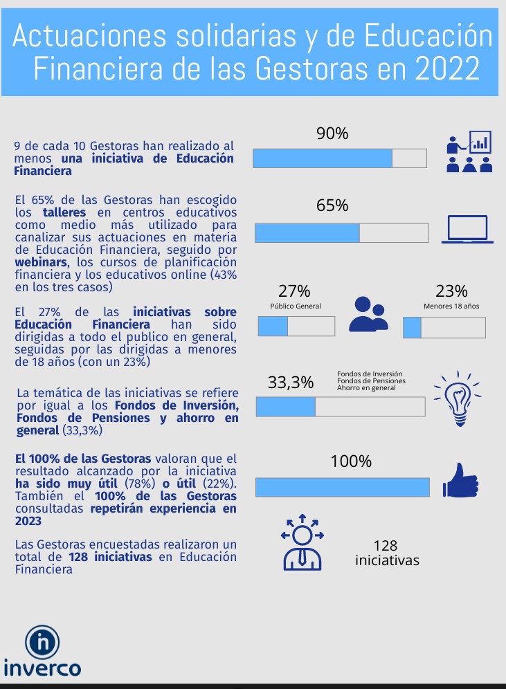 La última edición de la encuesta desveló que en 2022, 9 de cada 10 gestoras habían llevado a cabo alguna iniciativa relacionada con la educación financiera, la mayoría de ellas (65%) talleres o webinars en centros educativos. Los temas tratados se centraron en Fondos de Inversión, de Pensiones o ahorro en general.