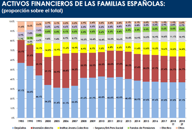 A finales del segundo trimestre del año, el ahorro financiero de las familias españolas en seguros ascendía a 238.575 millones, lo que supone un crecimiento del saldo en 2018 del 3%, según los datos del Banco de España recogidos por Inverco. Diferente evolución experimentaron los Fondos de Pensiones: el saldo ascendió a 118.083 millones, con una caída del 1,2% en el primer semestre. El peso de estos activos respecto al ahorro financiero total de las familias es del 10,9% y 5,4%, respectivamente.