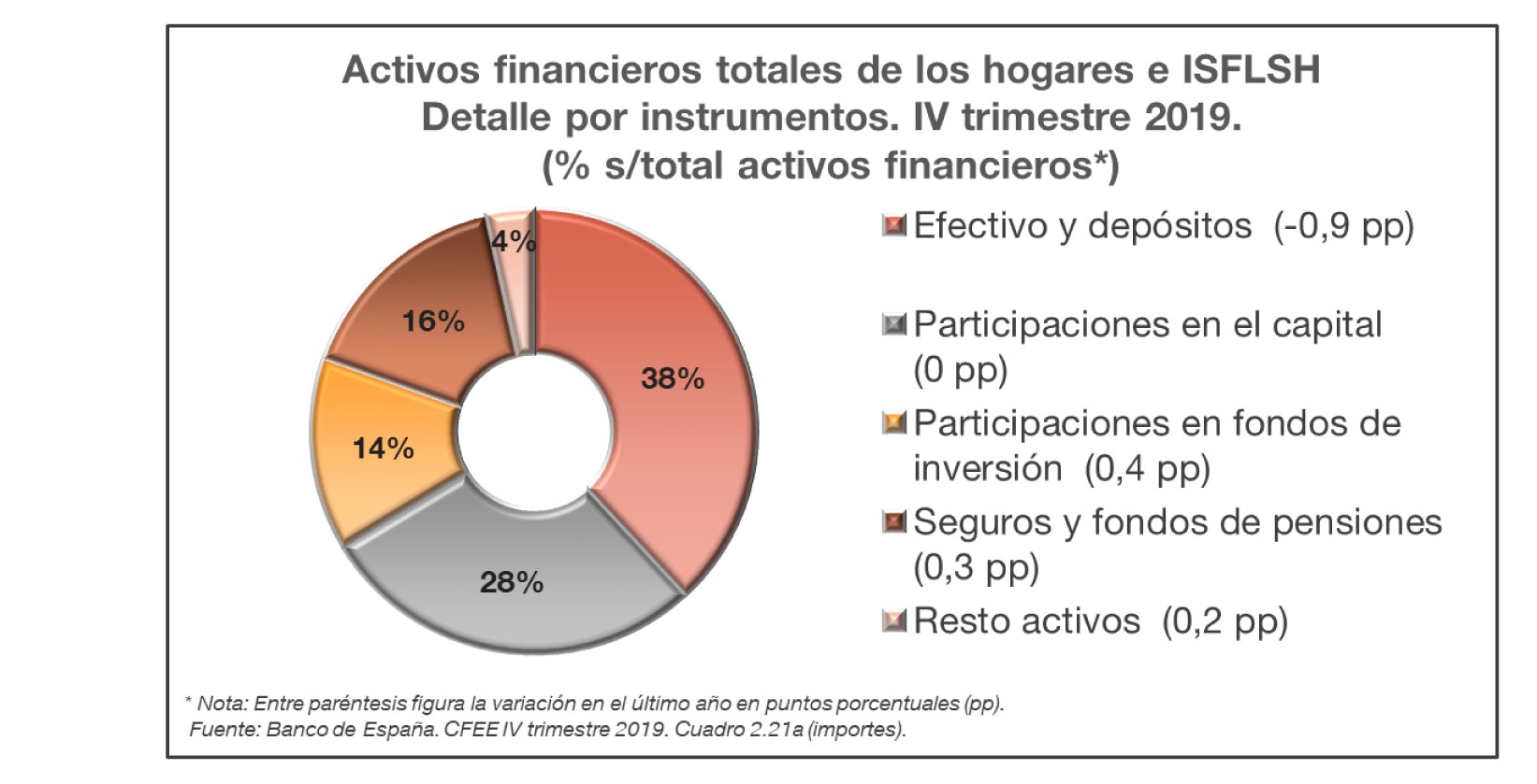 El grueso de los activos financieros de los hogares se mantiene en efectivo y depósitos (38%), por delante de las participaciones en capital (28%) y los seguros y Fondos de Pensiones (16%).