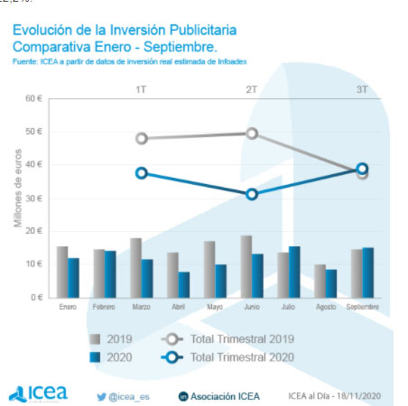 La inversión publicitaria del sector asegurador ha experimentando un crecimiento en el tercer trimestre del 2,8% respecto al mismo periodo del año anterior después de una primera parte del año peor. Según los datos de ICEA, el acumulado de los primeros 9 meses de inversión ronda los 107 millones, un 20,2% menos que en el mismo periodo de 2019. La cifra está en línea con la caída de esta inversión de manera general, que cae el 22,2%.