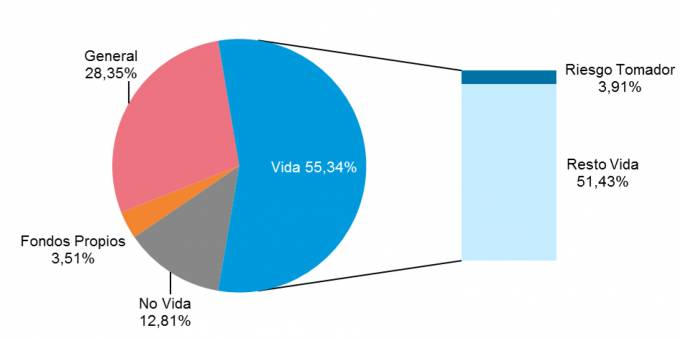 El sector asegurador español contaba con 327.274 millones de euros en inversiones a finales de septiembre. Según los datos de ICEA, el 55,34% de esas inversiones corresponden al negocio de Vida; de ellas, casi el 3,91% son con riesgo al tomador. Al segmento general corresponde el 28,35% de las inversiones, al negocio de No Vida el 12,81% y los Fondos Propios el 3,51%.