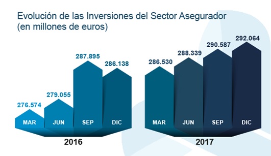 El volumen estimado del total de las inversiones del sector asegurador en el cuarto trimestre del año 2017 alcanzó los 292.064 millones de euros, según datos facilitados por ICEA. El 55,6% de dicho volumen representa la inversión de la cartera de Vida, el 13,1% la correspondiente a No Vida, el 26,8% a la cartera general, los fondos propios suponen un 4,2% y el 0,3% restante corresponde a otros fondos internos.
