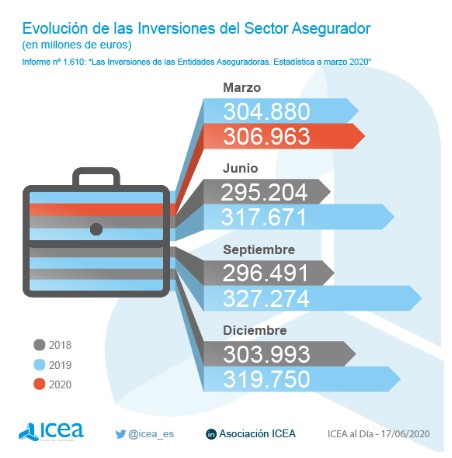 En cuanto a la participación de las inversiones del sector al finalizar el primer trimestre de 2020, la cartera de Vida representa el 55% del total del volumen, mientras que el 12,6% corresponden al negocio de No Vida, un 3,7% a los fondos propios y el 28,7% lo acapara la cartera general.