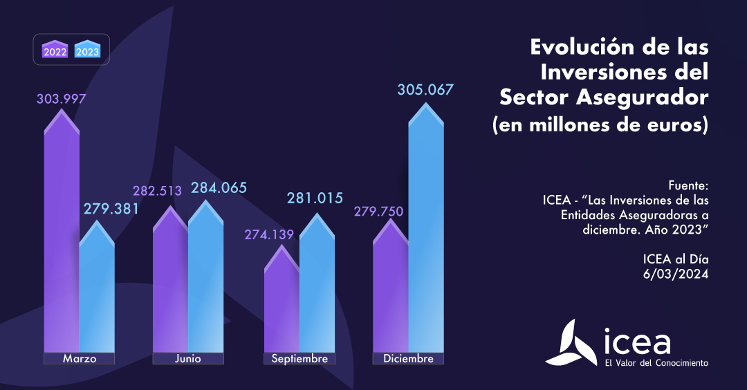 Al cierre del cuarto trimestre de 2023 el volumen estimado del total de las inversiones del sector asegurador español alcanzó los 305.067 millones de euros, muy por encima de los 281.015 del tercer trimestre y recuperando la marca de los 300.000 millones. Los datos de ICEA muestran que el 48,1% de dicho volumen representa la inversión de la cartera de Vida, el 14,9% la de No Vida, el 33,6% la cartera general y el 3,4% restante los fondos propios.