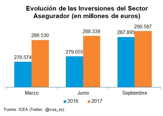 El volumen estimado del total de las inversiones del sector asegurador español en el tercer trimestre de 2017 alcanzó los 290.587 millones. El 55,8% de dicho volumen representa la inversión de la cartera de Vida, el 12,6% la correspondiente a No Vida, un 4,4% a los fondos propios, otros fondos internos un 0,3% y el 26,9% restante a la cartera general.