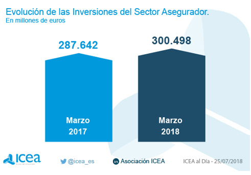 El volumen estimado del total de las inversiones del sector asegurador española en el primer trimestre de este año se situó en 300.498 millones de euros, lo que indica un crecimiento del 4,5% respecto a marzo de 2017. Según los datos de ICEA la cartera de Vida acapara el 55,4% del volumen total y el 12,9% a No Vida, un 4,2% a los fondos propios, los otros fondos internos se llevan el 0,3% y el 27,1% restante lo cubre la cartera global.