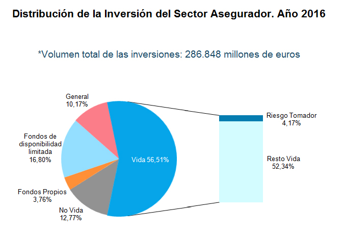 El volumen total de las inversiones del sector asegurador alcanzaron los 286.848 millones de euros el pasado año, según los datos del informe ‘Las inversiones de las entidades aseguradoras. Estadística año 2016’ elaborado por ICEA. La mayor parte de estas inversiones corresponden a la cartera de Vida situándose en el 56,5% del total. De esta parte, algo más del 4% es el tomador quien asume el riesgo. El 16,8% de las mismas corresponden a los fondos de disponibilidad limitada y el 12,7% a la cartera de No Vida.