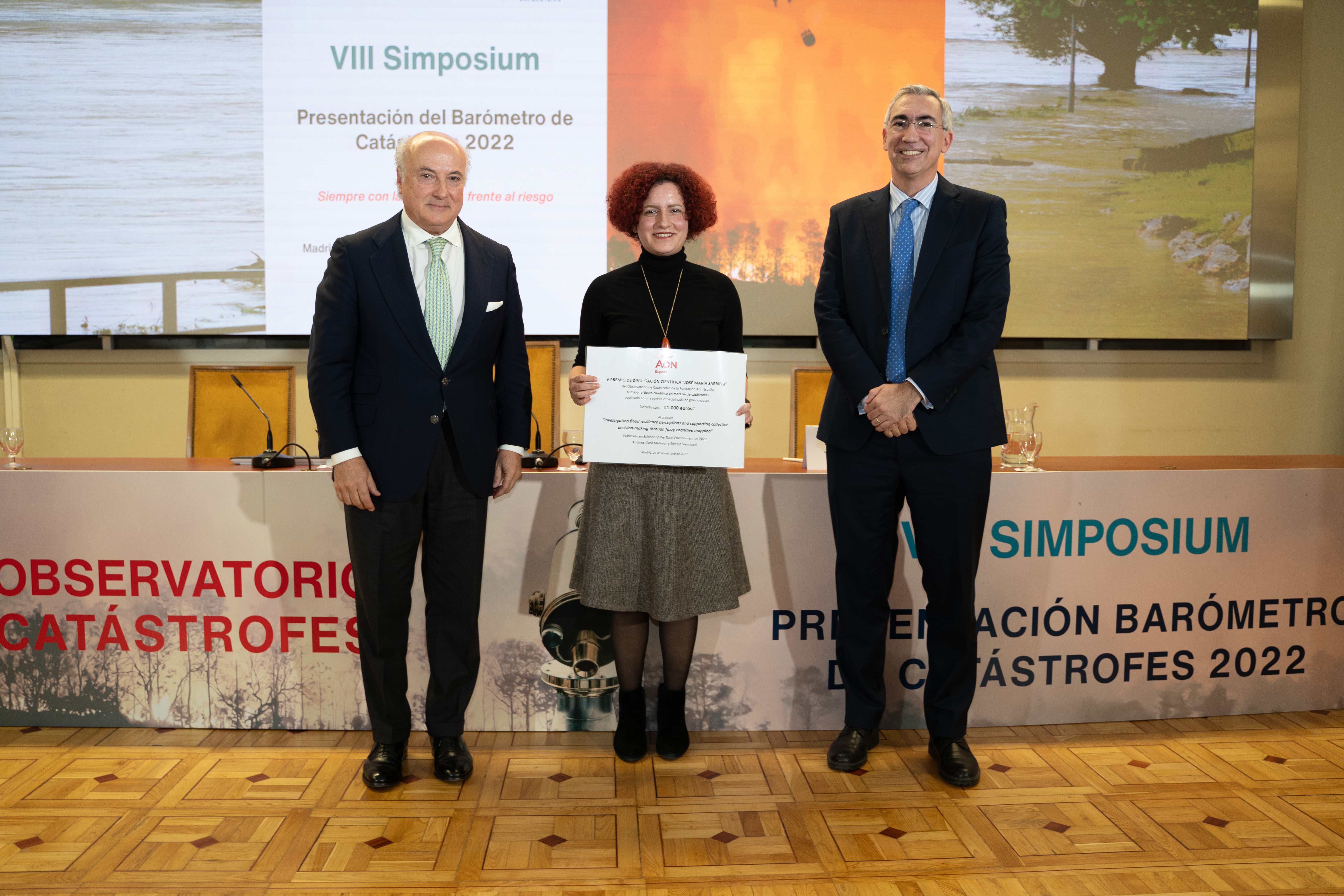 La entrega del galardón se celebró el pasado 23 de noviembre durante el VIII Simposium del Observatorio. Entregaron el galardón Raúl Antón, director de la Escuela de Ingeniería Tecnun de la Universidad de Navarra, y Pedro Tomey, presidente del Observatorio, quien expresó que "el Jurado, compuesto por representantes del Observatorio y Tecnun, ha valorado muy positivamente la contribución de esta investigación, que responde a una necesidad real en la gestión de desastres de forma innovadora", y añadió: "Este artículo propone una combinación de métodos de modelización y medición que va a ayudar a los responsables de la toma de decisiones a definir sus estrategias de resiliencia ante las inundaciones, la catástrofe natural que mayor daños genera en España."