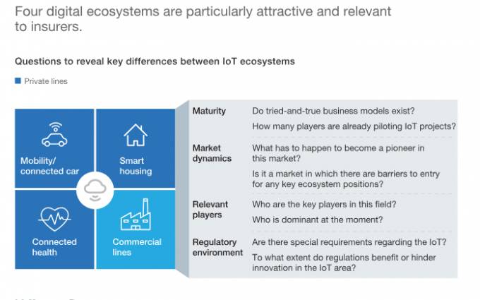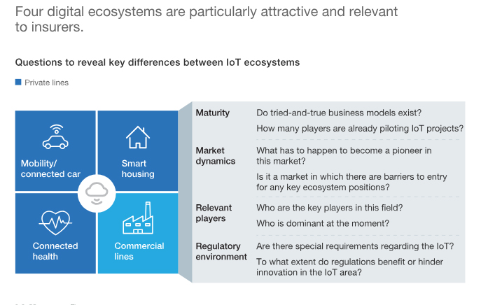 McKinsey & Company ha presentado el informe Ecosistemas digitales para aseguradoras: oportunidades a través de la Internet de las cosas, que las oportunidades y el valor que el Internet de las Cosas (IoT) es capaz de generar en las compañías aseguradoras de todo el mundo. Destaca cuatro ecosistemas digitales del entorno de los seguros en los que el IoT generará un especial impacto en sus servicios y modelos: coche conectado y movilidad, casa inteligente, salud conectada y líneas comerciales.