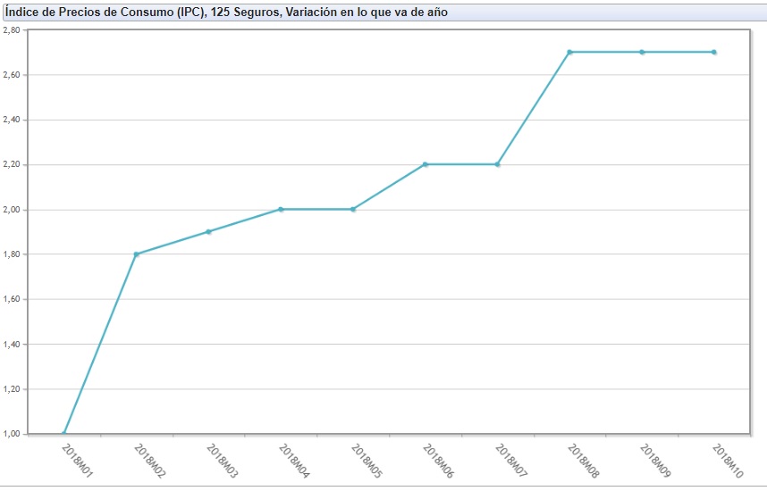 El IPC de seguros del mes de octubre se ha quedado en el 0%, aunque el acumulado del año ha crecido hasta el 2,7% escalando desde el 1% que marcaba en el mes de enero. Las mayores subidas anuales se produjeron en febrero que llegó al 1,9% y en agosto que llegó al 2,7% permaneciendo estable hasta ahora.