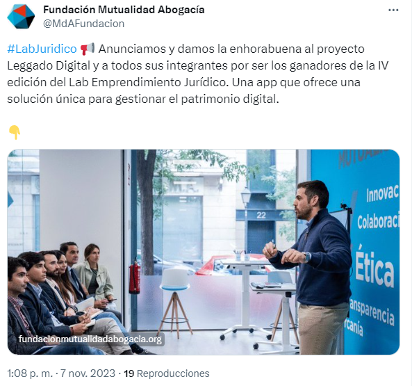 Fundación Mutualidad ha anunciado el nombre del proyecto ganador del IV Lab Emprendimiento Jurídico, su programa de preincubación, incubación y aceleración de startups. Así, el proyecto ganador es Leggado Digital, que obtiene 10.000 euros en concepto de premio capital semilla.