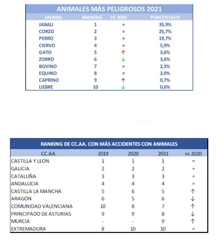 El informe también destaca al jabalí, y concretamente al que pasa por Castilla y León, como el animal más peligroso y protagonista de estos accidentes. En 2021 este animal es el que más siniestros ha provocado con el 36%, seguido del corzo (26%) y el perro (20%). Los tres animales representan el 82% del total de siniestros que ha registrado Ponle Freno. En el lado contrario se encuentran liebres y zorros.