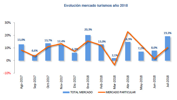 Julio logra un incremento de las entregas de turismos y todoterrenos del 19,3% respecto del mismo periodo del año pasado, hasta las 131.176 unidades, con un día laborable más que en el mismo mes del año pasado. "La buena marcha de la economía y el periodo vacacional permiten mantener el tono positivo de la demanda en un mes tradicionalmente fuerte para las matriculaciones", comentan desde Anfac.