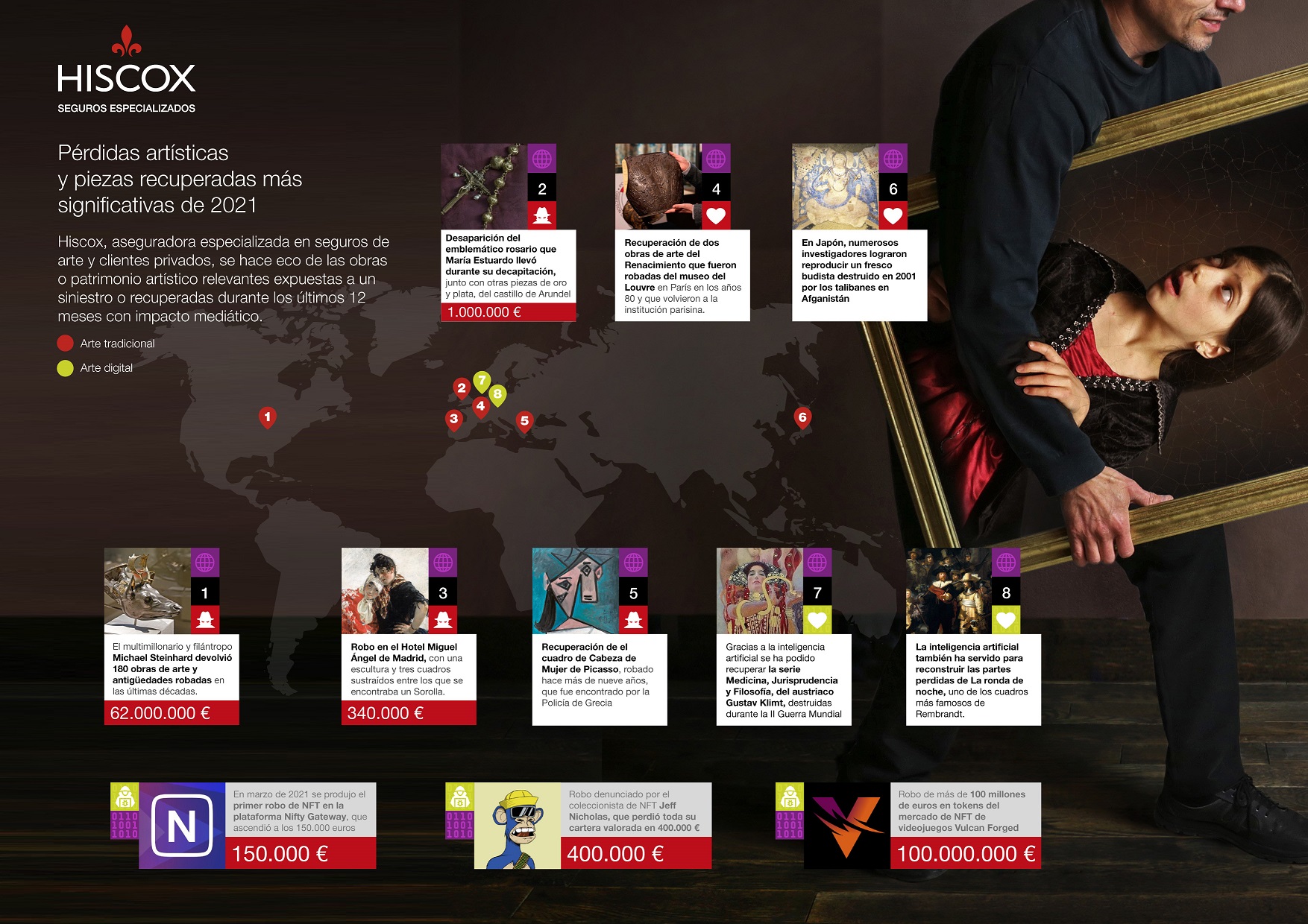 Como explica Eva Peribáñez, responsable técnico del departamento de Arte y Clientes Privados de Hiscox España, "el arte siempre ha sido un objetivo atractivo para los ladrones por su alto valor, por eso no es de extrañar que en 2021 hayamos sido testigos del auge del arte digital con los NFT y, por tanto, de sus robos. Para ello los ciberdelincuentes han recurrido a las mismas técnicas de ciberataques empleadas comúnmente contra las empresas. Por eso, no podemos bajar la guardia en el entorno digital ni en el físico, donde debemos aumentar, más si cabe, las medidas de concienciación y protección para asegurar obras que más allá de su valor económico tienen un valor patrimonial incalculable".