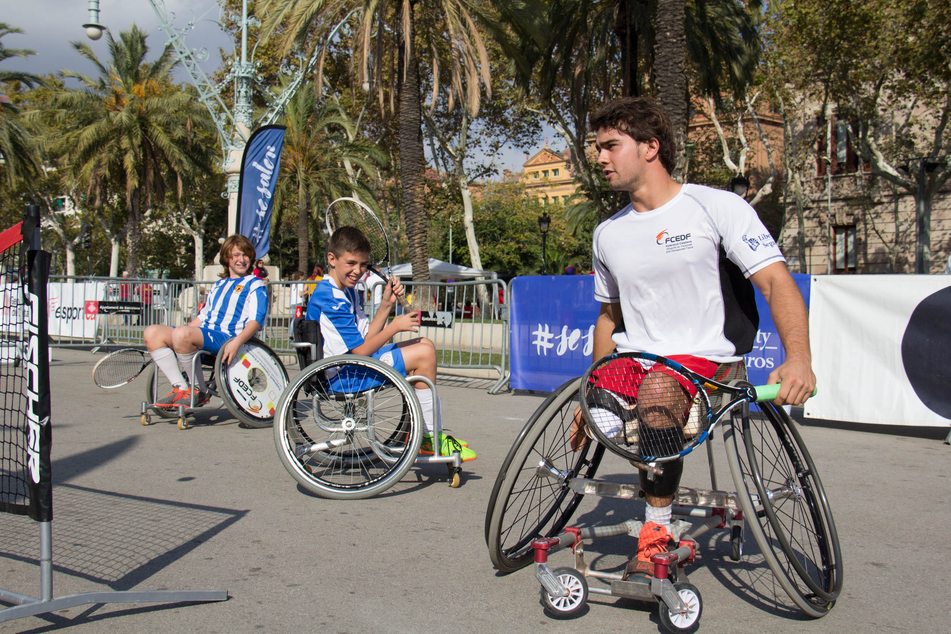Daniel Caverzaschi, uno de los integrantes del proyecto #SeSalen que la aseguradora desarrolla desde 2015, estuvo jugando al tenis en silla de ruedas con las personas que se acercaron a las instalaciones en el Arco del Triunfo de Barcelona. Con esta jornada, el Ayuntamiento de Barcelona y la Federació Catalana d' Esport Adaptat a Catalunya, pretenden cada año promover la inclusión de la discapacidad a través del deporte.