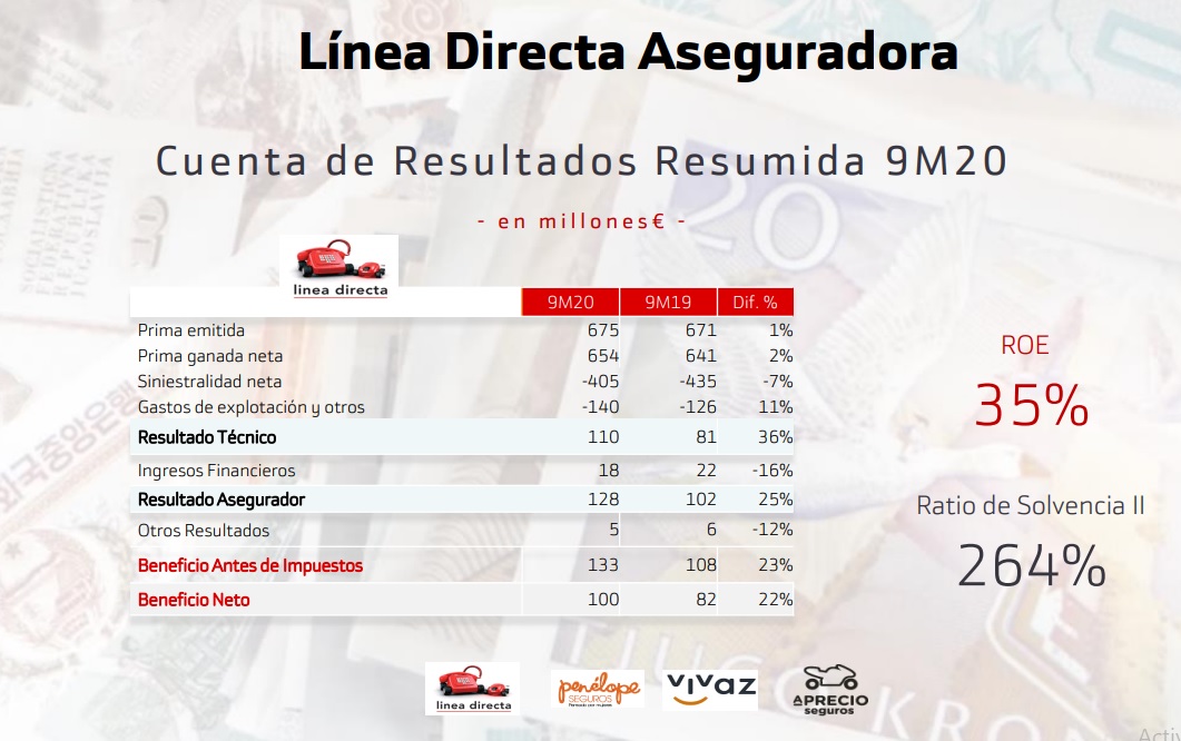 Línea Directa Aseguradora, que este año presenta sus resultados de forma desagregada de la actividad bancaria de Bankinter, alcanza un beneficio neto de 100 millones de euros, un 22% más que en el mismo periodo de 2019, con un ROE del 35% y un ratio combinado del 83,3%. El ratio de solvencia II se sitúa en el 264%.