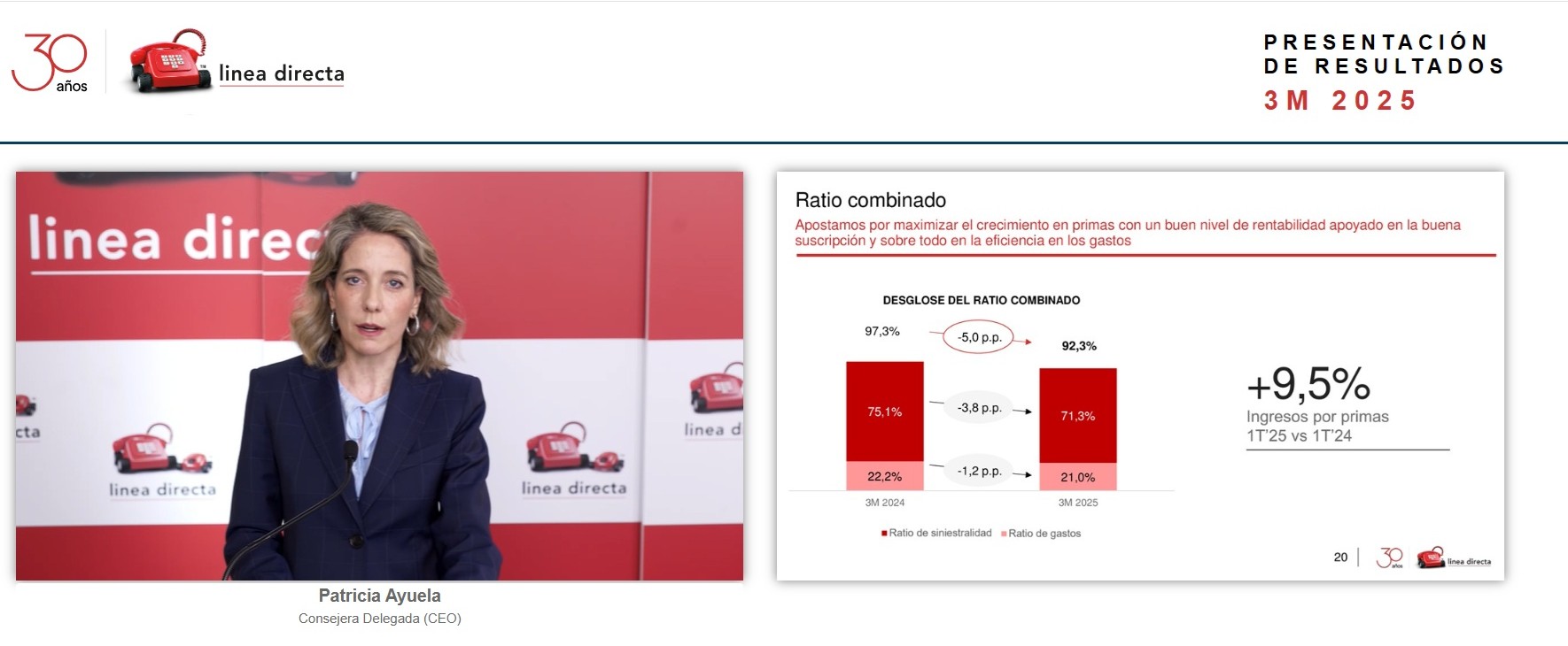 La consejera delegada de Línea Directa, Patricia Ayuela, ha vuelto a insistir, igual que lo hacía el pasado enero, en que, aunque la compañía evoluciona muy positivamente "puede llegar a cotas más altas". En este inicio de año los resultados acompañan y, por el momento, a la espera de la evolución de los nuevos ramos en los que ha entrado recientemente, Salud solo parece ser su único punto débil.