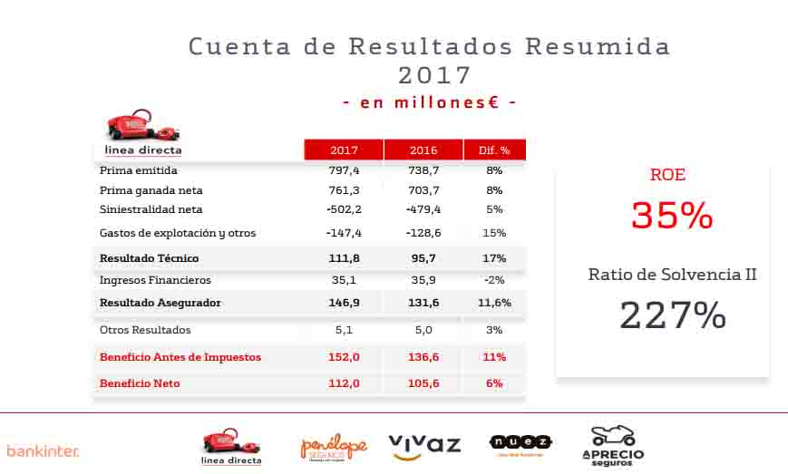 La aseguradora de Bankinter, Línea Directa, ha cerrado el pasado año con un beneficio neto de 112 millones de euros, mejorando en un 6% el resultado de un año antes. El ratio combinado de la entidad se encuentra en el 86,9%, un 1% mejor que en 2016. El resultado técnico creció un 17%, mientras que los ingresos financieros se contrajeron un 2% hasta los 35 millones de euros. El ratio de Solvencia II se situó en el 227%.