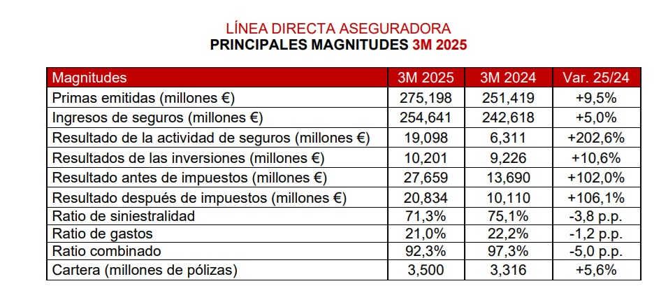 Línea Directa ha iniciado 2025 duplicando su beneficio neto hasta los 20,8 millones de euros en el primer trimestre, lo que supone, en concreto, un aumento del 106,1% respecto al mismo periodo del año anterior.