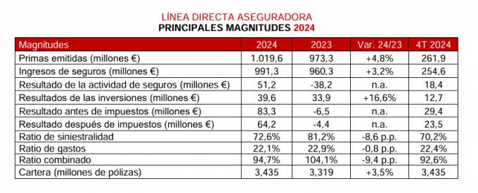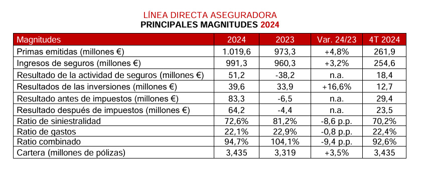 Línea Directa gana en 2024 más de 64 millones mejorando su ratio combinado en 9,4 puntos
