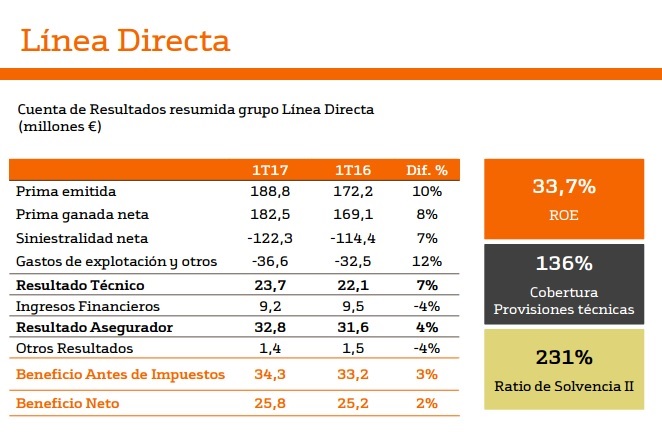 Línea Directa cerró el primer trimestre de 2017 con un beneficio neto de 25,8 millones de euros, lo que supone un incremento del 2% respecto al mismo periodo de 2016.