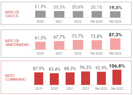 El ratio de siniestralidad ha aumentado 14,5 puntos, elevándose hasta el 87,3%, y el ratio combinado ha empeorado 13,9 puntos, disparándose hasta el 106,8%. En cuanto al ratio combinado, la compañía argumenta que se debe a la persistente presión de la inflación de los costes de prestación en los ramos de Autos, fundamentalmente, y Hogar, y al incremento en los últimos ejercicios del baremo de lesiones. En Hogar, el ratio combinado ha empeorado 4,3 puntos, situándose en el 97,7%, debido al impacto de los siniestros atmosféricos y de agua. No obstante, en lo que respecta solo al tercer trimestre, la compañía ha logrado reducir en 7,1 puntos el ratio de siniestralidad respecto al trimestre anterior gracias a una disminución del coste siniestral (-6,4%), lo que se traduce en una mejora de 6,1 puntos en el ratio combinado desde julio a septiembre, cerrando en 103,6%, con una evolución destacada en Motor, donde ha mejorado casi 9 puntos respecto al trimestre anterior para cerrar en el 102,9%.