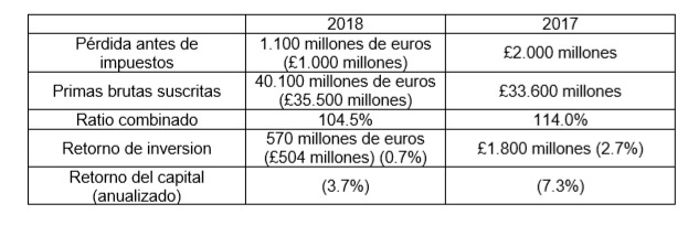 En cuanto al volumen de primas el Lloyd´s registró 40.100 millones de euros (35.500 millones de libras frente a los 33.600 millones de 2017), lo que indica un crecimiento del 5,6% respecto al año anterior. El retorno neto de inversión fue de 570 millones de euros (504 millones de libras) muy lejos de los 1.800 millones de libras de un año antes. Por su parte, el ratio combinado mejoró el pasado año hasta situarse en el 104,5% mejorando los datos de 2017 cuando este ratio se situó en el 114%.