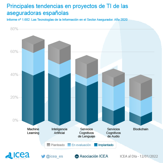 Los datos de ICEA confirman que dentro de las tendencias de TI en seguros los principales proyectos ya están implantados son los relacionados con el Machine learning (43,9% de las entidades) y la Inteligencia Artificial (41,5%). Mientras, además de los anteriores, dentro de aquellos proyectos aún no implantados pero en evaluación destacan los Servicios Cognitivos de Audio (17,1%) y Blockchain (14,65% de las entidades).