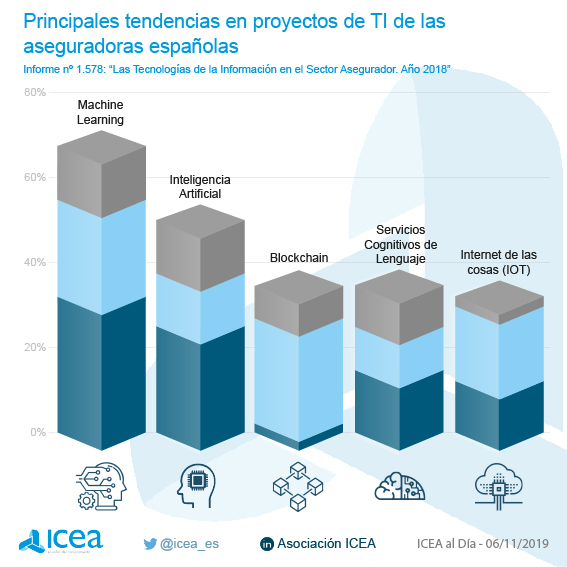 El Machine Learning y la Inteligencia Artificial comienzan a ser una realidad en el sector asegurador español. Según datos facilitados por ICEA, un 32,5% de las entidades encuestadas reconocen que ya han implantado proyectos de Machine Learning, siendo así la principal tendencia en el seguro en lo referente a Tecnologías de la Información. Y la siguiente es la Inteligencia Artificial, como afirman el 25% de las compañías.