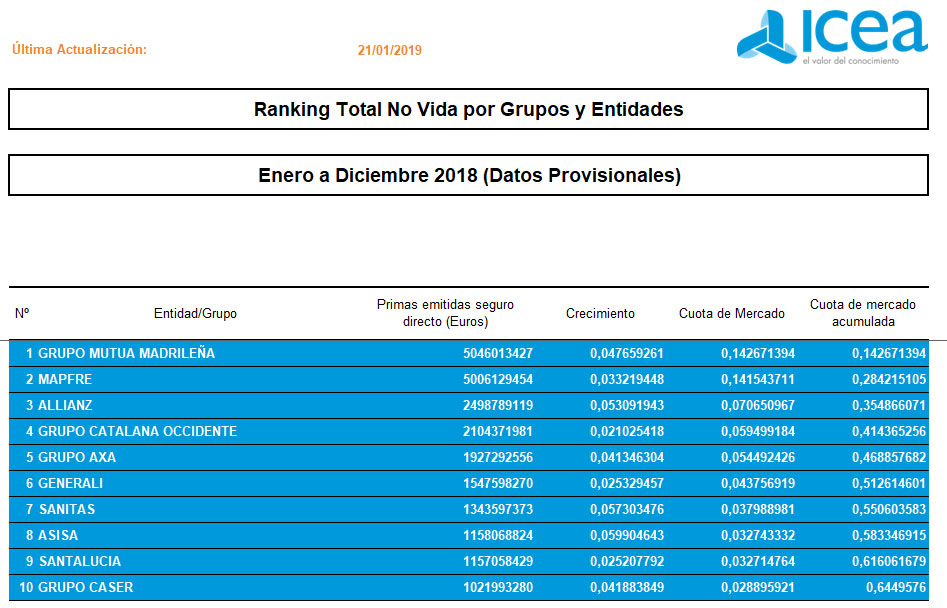 El fin de 2018 ha traído cambios en el ranking de seguros, más allá de un crecimiento del 1,3% en el sector. El principal es que Mutua Madrileña lidera por primera vez el ranking No Vida por 40 millones de primas sobre Mapfre. La entidad que preside Ignacio Garralda consiguió unas primas totales en seguros Generales de 5.046 millones, con un crecimiento del 4,77%, según los datos de ICEA a cierre del ejercicio.