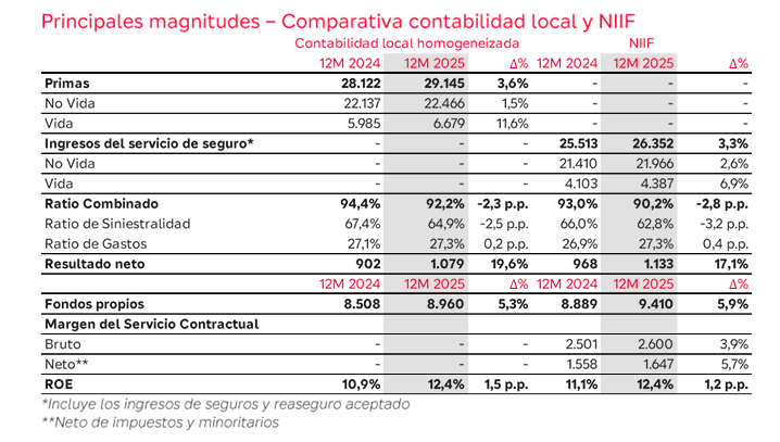 El volumen de primas también es otra de las cifras destacadas al alcanzar un total de 29.145 millones de euros, con un avance del 3,6% en comparación con diciembre de 2024. El negocio de No Vida del grupo mejoró un 1,5% hasta registrar 22.466 millones, mientras que en Vida se incrementó un 11,6% y registró 6.679 millones de euros.