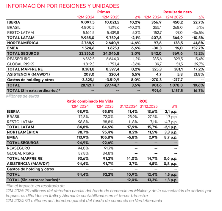 En EMEA, Mapfre cuenta con 1.625 millones en primas, un 6,6% más que hace un año con avances destacados en sus negocios de Alemania e Italia. Por su parte, el negocio de Turquía continúa afectado por la hiperinflación y la depreciación de la lira turca (-27,5%). De hecho, el impacto en el resultado de los ajustes por hiperinflación en Turquía está en línea con el año anterior (-19 millones en 2025) y el resultado financiero se beneficia de los altos tipos de interés en este país. El resultado atribuible alcanzó los 16 millones (-30 millones en 2024) con aportaciones positivas de Turquía y Malta.