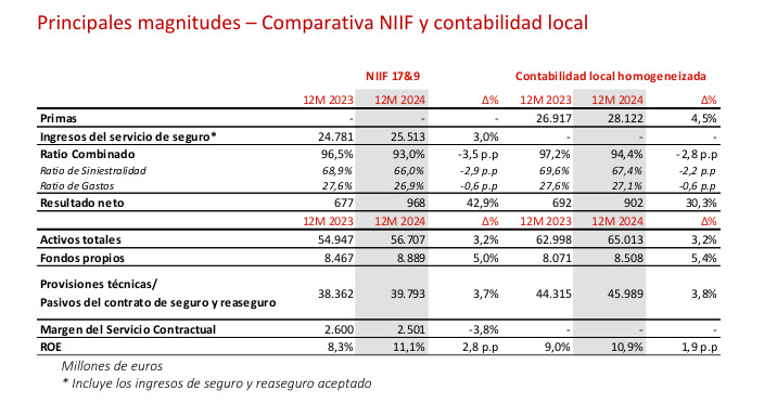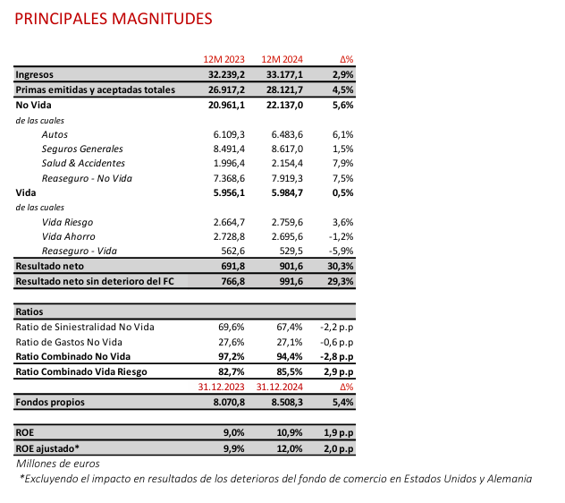 Los ingresos del grupo durante el pasado año alcanzaron los 33.177,1 millones, un 2,1% superiores a 2023. De ellos, el volumen de primas alcanzado fue de 28.121,7 millones, lo que muestra un incremento del 4,5%.