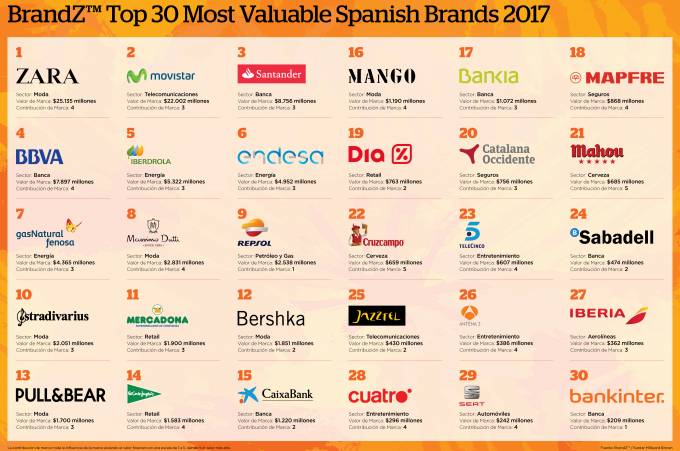 El ranking sitúa el valor conjunto de las 30 marcas en 103.103 millones de dólares (87.517 millones de euros). De este total, el 67% lo acumulan las 5 primeras firmas de la clasificación.
