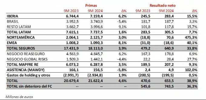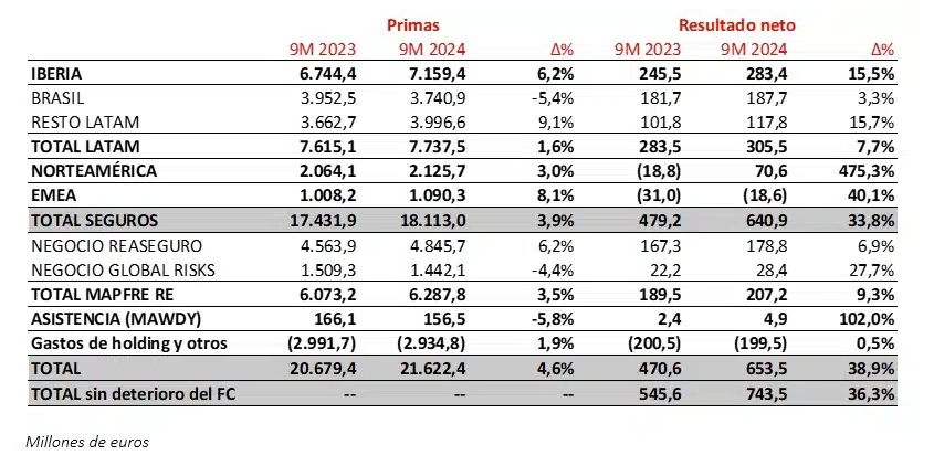 La región de Latam donde se incluye Brasil junto al resto de países de la región logró mejorar sus primas un 1,6% al lograr 7,737 millones y el beneficio casi un 8% hasta superar los 305 millones. La unidad de Norteamérica obtiene resultados después de perder el pasado año más de 18 millones; al cierre de septiembre aporta al grupo cerca de 71 e incrementa sus ingresos un 3% al cerrar el trimestre con 2.125 millones.