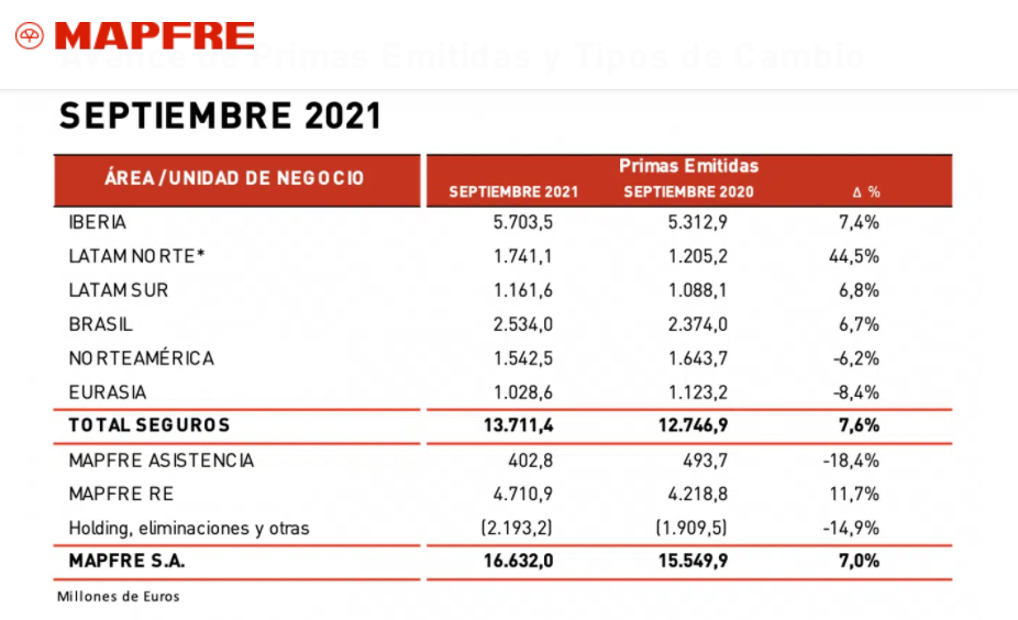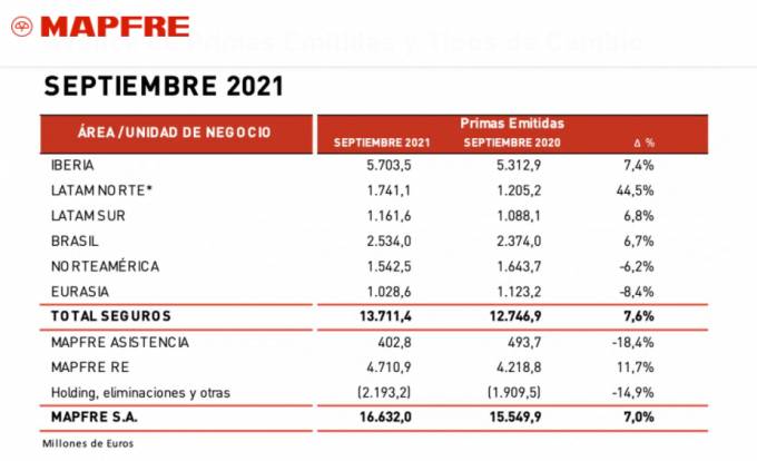 Mapfre ha adelantado sus datos al tercer trimestre del año donde alcanza un volumen de primas totales emitidas de 16.632 millones de euros, que refleja un crecimiento del 7%. Iberia, con la mayor participación de España, ha logrado primas por 5.703,5 millones, y un crecimiento del 7,4% frente a los datos del pasado septiembre.