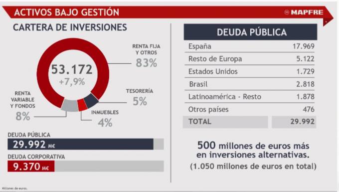 La parte de deuda pública de la aseguradora en sus inversiones asciende hasta casi los 30.000 millones de euros, siendo la corporativa casi 9.400 millones. Dentro de la deuda pública, la española acapara 17.969 millones, el resto de Europa se lleva 5.122 millones, Brasil 2.818, resto de América Latina 1.878 y Estados Unidos 1.729 millones.