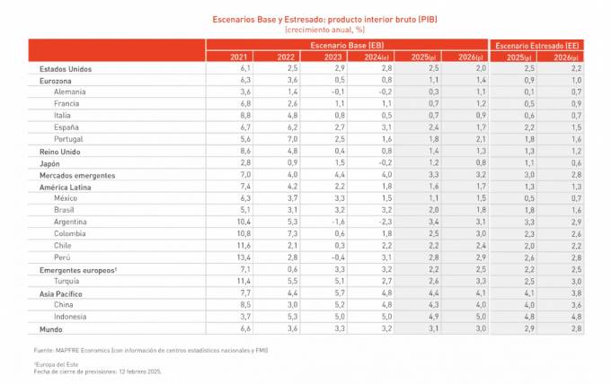 Para la eurozona, Mapfre Economics prevé un desempeño en general "débil" determinado por "los los obstáculos todavía sin resolver y por el incierto desafío comercial". En líneas generales, el grupo asegurador esepra un aumento del PIB del 1,1% este año y del 1,4% el siguiente; la inflación quedará en el 2,3% al cierre del 2025 y bajará al 1,7% en 2026.