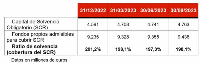 En septiembre de 2023, el Grupo Mapfre ha registrado un ratio de solvencia del 198,1%, incluyendo medidas transitorias. Es el mismo que ya marcó el grupo asegurador en marzo, pero es 8 décimas mayor que el margen con el que acabó el primer semestre. Excluyendo los efectos de dichas medidas, este ratio sería del 189,7%, frente al 188,8% de junio de 2023.