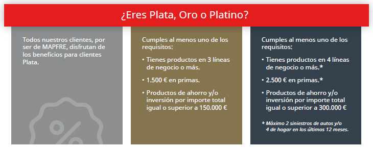 Cualquier cliente, por el hecho de tener un seguro con la compañía, se considera cliente 'Plata', con sus consiguientes ventajas. El siguiente escalón son los clientes 'Oro', aquellos que cumplen alguna de estas 3 condiciones: tener productos de 3 líneas de negocio, pagar primas anuales de al menos 1.500 euros o tener productos de ahorro o inversión por importe de 150.000 euros. Los clientes con mayor vinculación son considerados 'Platino' y deben tener productos de 4 líneas de negocio y un máximo de 2 siniestros de Automóviles y 4 de Hogar en el último año; o primas por importe de 2.500 euros anuales y un máximo de 2 siniestros de Automóviles y 4 de hogar en los 12 últimos meses o productos de ahorro/inversión por importe total de 300.000 euros.