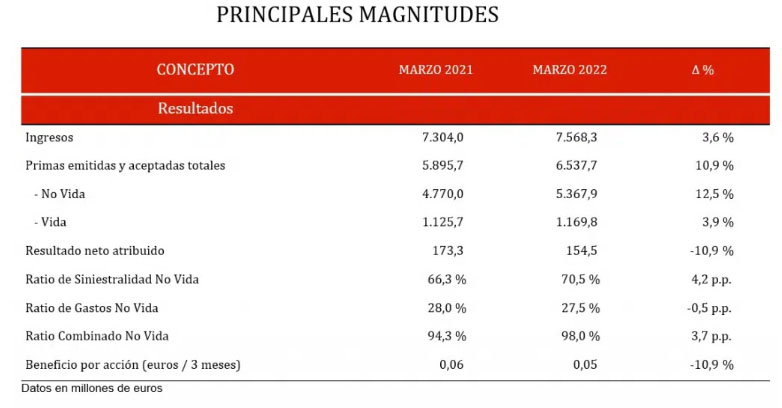 El ratio combinado de Mapfre se ha situado al cierre de marzo en el 98%, lo que supone un incremento de 3,7 pp. La entidad señala que se debe al incremento de la siniestralidad en Autos y Salud debido a la mayor frecuencia por el aumento de la movilidad y el incremento del coste medio impactado por las tensiones inflacionistas que se han agravado por la guerra en Ucrania. En Seguros Generales el ratio combinado se encuentra en el 92,6%.