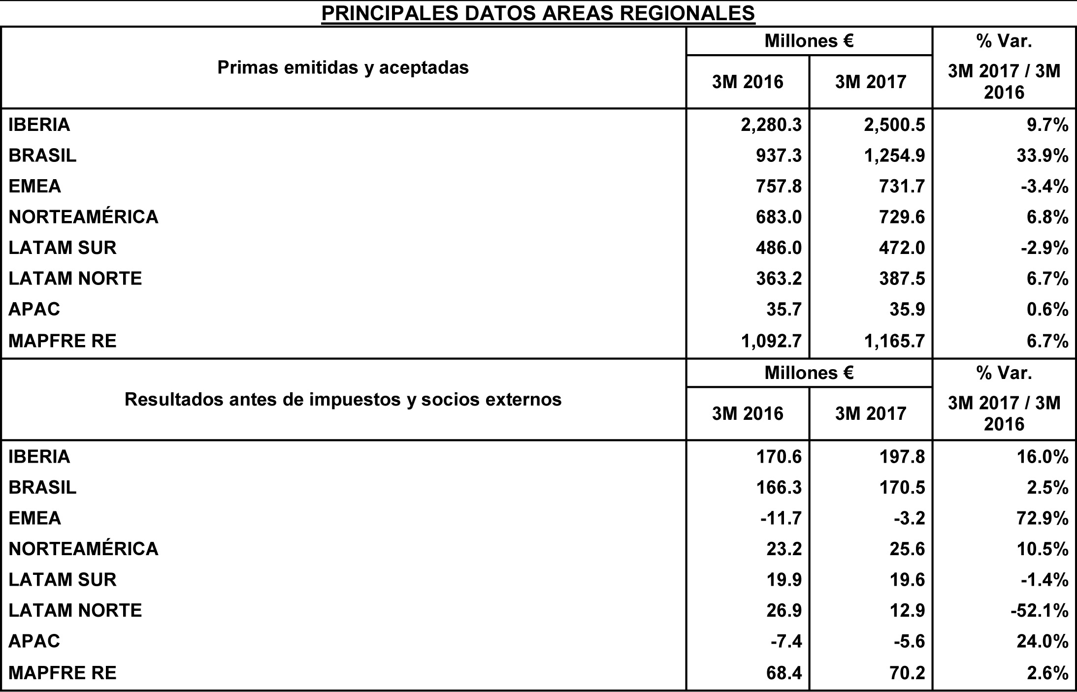 El beneficio neto de Mapfre en los 3 primeros meses de 2017 ascendió a 206 millones de euros, lo que supone un incremento del 7,5% respecto al primer trimestre del año anterior. España, Brasil y Estados Unidos, junto con Mapfre Re impulsan este crecimiento. Las primas se situaron en 6.675 millones, un 9,2% más. La aseguradora destaca el buen comportamiento del negocio de Vida en el Área Territorial Iberia y la evolución de los seguros generales y de Vida en Brasil. El negocio se ha visto favorecido por el impacto positivo de la evolución de las monedas, especialmente del real brasileño y el dólar estadounidense.