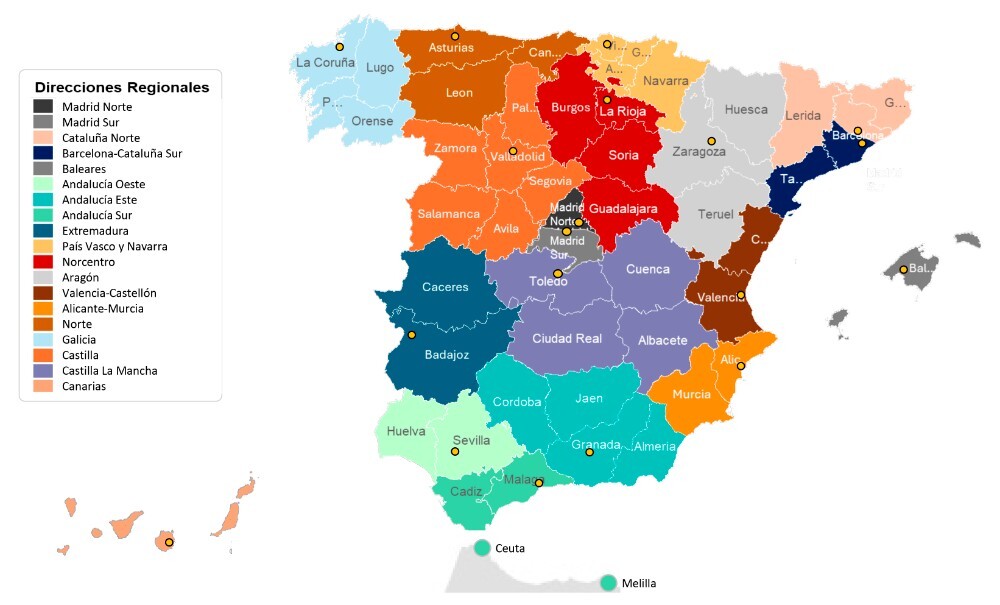 La nueva estructura, más ligera que la anterior, asegura Mapfre, contará con 19 direcciones regionales distribuidas en función del territorio, afinidad regional, proximidad, población, volumen de negocio o potencialidad de crecimiento, entre múltiples aspectos. Cada una de estas direcciones tendrá a su vez 3 direcciones comerciales -Empresas y Patrimoniales, Vida y Clientes y desarrollo de red-. Hoy la entidad cuenta con 9 direcciones generales territoriales y 24 direcciones territoriales.