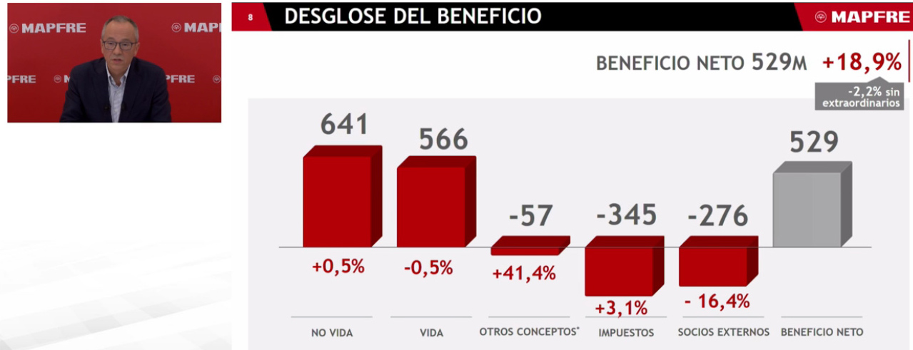 El CFO de Mapfre ha mostrado su satisfacción por los resultados obtenidos por el grupo y ha anunciado el mantenimiento de los compromisos con los accionistas: "El principal impulsor de los dividendos siguen siendo los resultados. Este año superaremos los 700 millones de beneficios en ausencia de catástrofes relevantes".