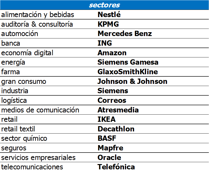 Por otro lado, han sido elegidas como mejores empresas para trabajar en sus respectivos sectores: ING, Siemens, Decathlon, Atresmedia, IKEA, Siemens Gamesa, Correos, Mercedes Benz, GlaxoSmithKline, Nestlé, BASF, KPMG, Oracle, Johnson & Johnson, Amazon y Telefónica.