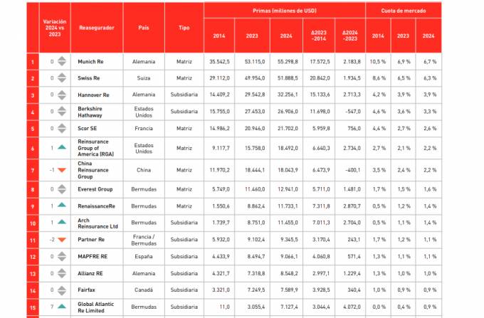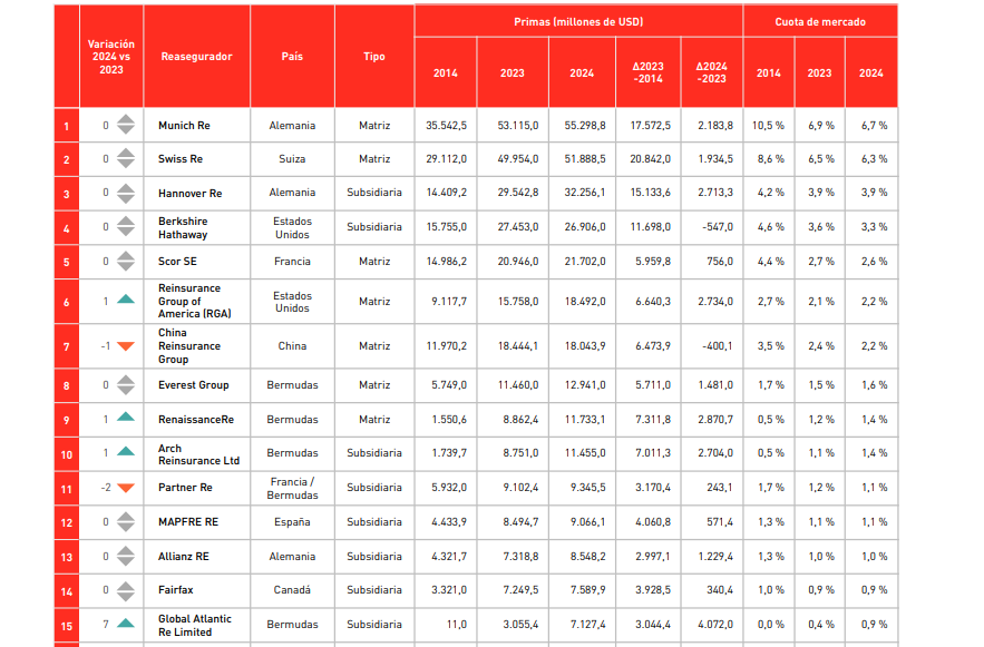 Mapfre Re se situó al cierre de 2024 como la 12ª mayor reaseguradora del mundo por volumen de primas (brutas aceptadas), según el Ranking de Reaseguradores elaborado por Mapfre Economics, publicado por primera vez este año y que clasifica a las 25 mayores compañías globales del sector. Según el informe, Mapfre Re asciende a esa posición "tras una década de crecimiento sostenido".