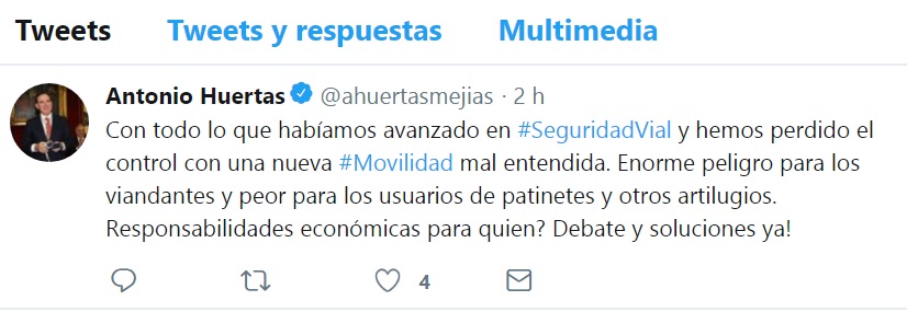 El presidente de Mapfre, Antonio Huertas, ha dejado en Twitter una reflexión acerca de la seguridad vial de los nuevos "artilugios" de movilidad. Destaca que se había avanzado en seguridad vial y ahora "con la nueva movilidad mal entendida" cree que "hemos perdido el control". Asegura que esta forma de entender y aplicar la movilidad supone un peligro para los viandantes y "peor para los usuarios de patinetes".