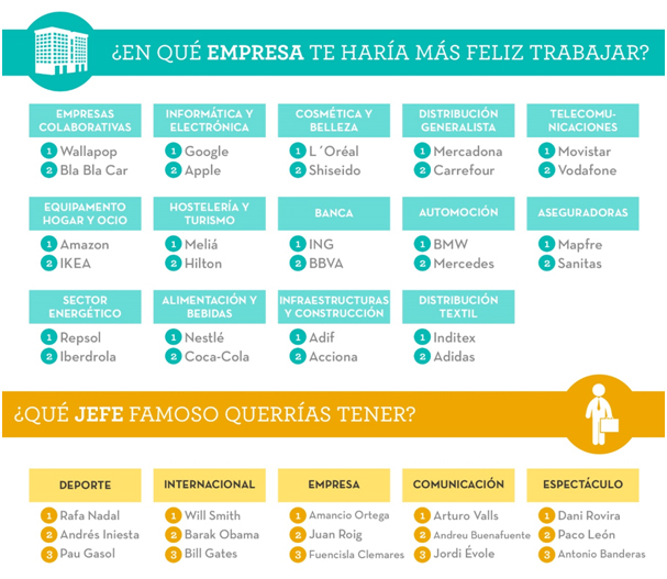 Teniendo en cuenta a todos los sectores, para los españoles la compañía donde más felices serían trabajando sería Wallapop que ha obtenido el 50,3% de los votos y desbanca a Google que ha liderado la encuesta los años anteriores (47,7%). En tercer lugar se sitúa L´Oreal que consigue el 46% de los votos.